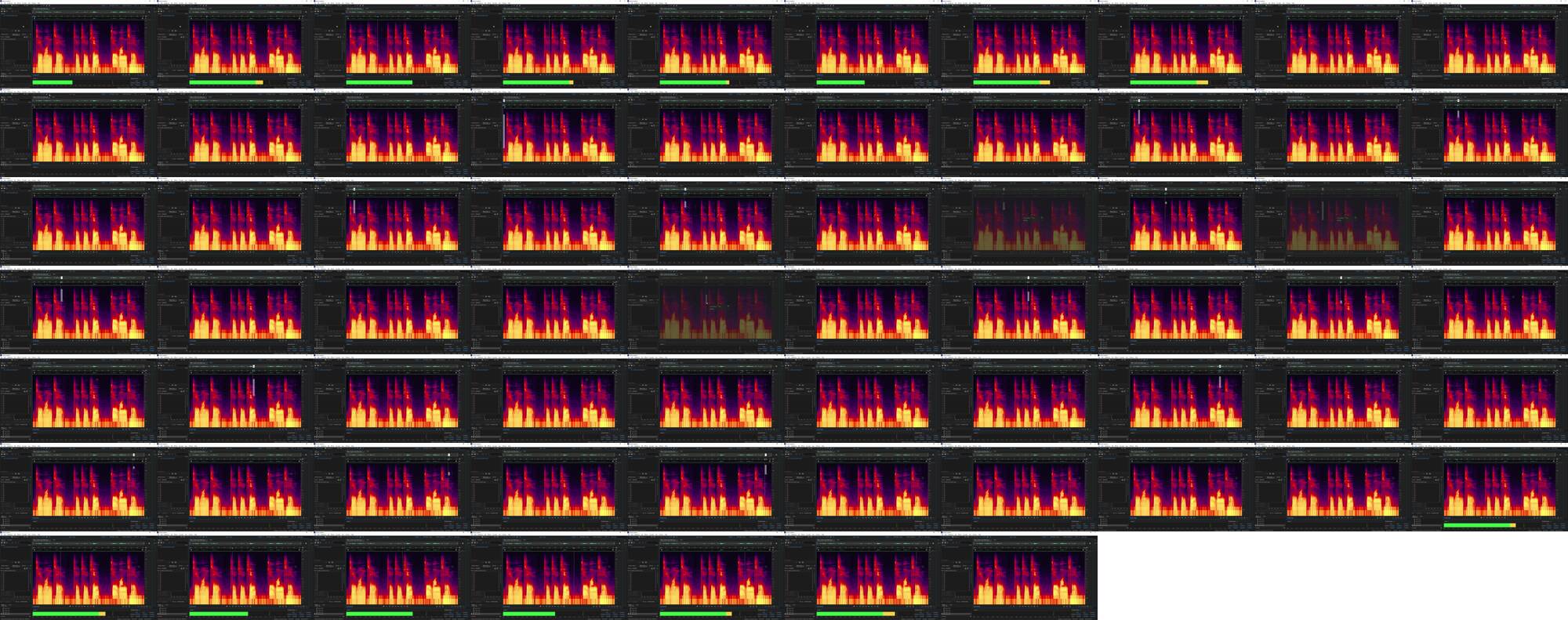 通过一些练习,您甚至可以在听到它们之前就开始在频谱频率显示中发现它们。它们在中高频中表现为锋利的针状形状,在下面的示例中您会发现大约二十个,尽管并非所有声音都能听到。