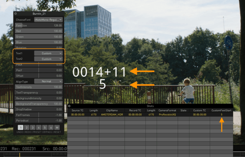 Transkoder的一项新功能允许轻松自定义脚+框架元数据。此元数据定义了$CustomFeet$燃烧,与第一帧偏移,这对电影行业测量电影镜头至关重要(例如1234+12)。通过在高级元数据设置下的镜头表标题项中包含CustomFeetStart来编辑此元数据,在节点页面中添加BurnIn节点,在HUD中选择Custom for Text1和/或Text2,然后输入$CustomFeet$和/或$CustomFeetStart$刻录。编辑镜头表中的CustomFeetStart列会更新图像上的两个刻录。