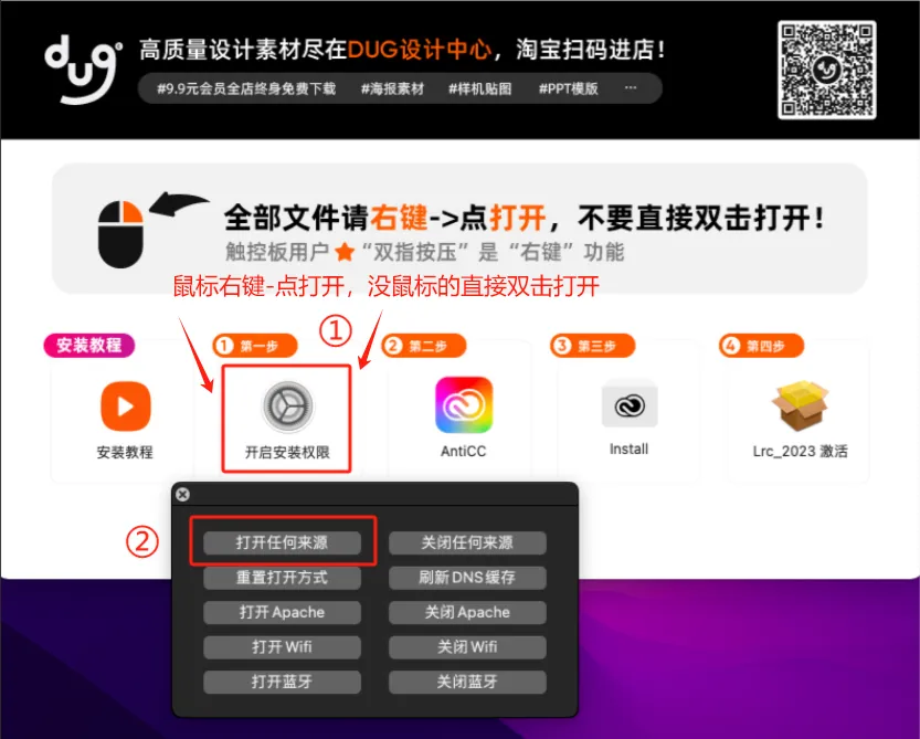 ①双击打开启安装权限图标,②点打开任何来源,输入开机密码(输完密码就结束了第一步)
