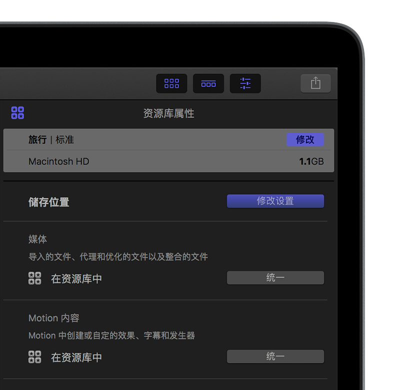 - 在“资源库属性”检查器中,点按“修改设置”。