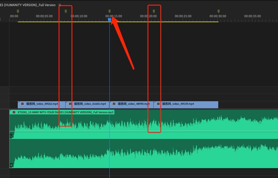 2.利用PR的Mark打点工具进行节奏打点,标记好要插入视频片段的节奏点;Use PR’s Mark marking tool to mark the rhythm and mark the rhythm points to be inserted into the video clip;