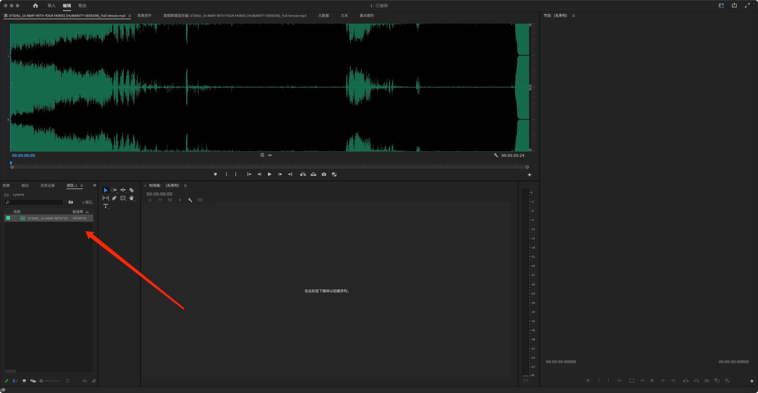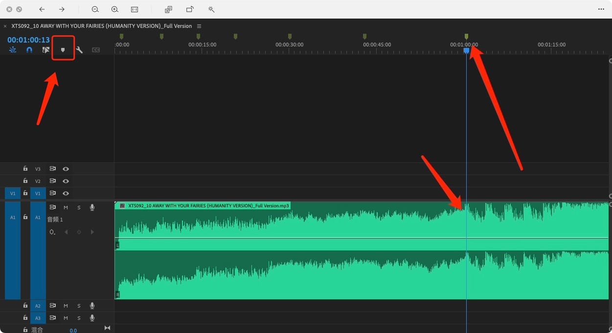 1.选择好一个节奏感较强的音乐,拖入时间线之中(因为我们要利用波形去打Mark点,节奏感越强,越好打点);Choose a music with a strong sense of rhythm and drag it into the timeline (because we need to use the waveform to mark points, the stronger the sense of rhythm, the better the mark);