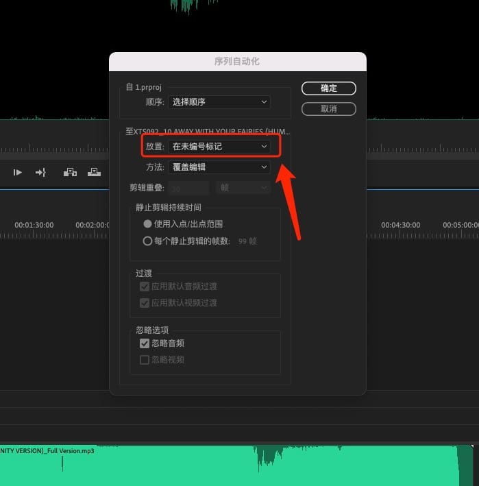 4。弹出“序列自动化”面板,“放置”处选择为“在未编号标记”,点击“确认”;此操作将素材自动导入到时间线上面的标记点上;The “Sequence Automation” panel will pop up, select “At Unnumbered Marker” for “Placement”, and click “OK”; this operation will automatically import the material to the marker point on the timeline;
